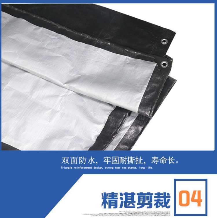 黑白色PE防水篷布立體包邊,加厚設計,邊緣美觀結實,使用壽命長,鍍鋅扣眼