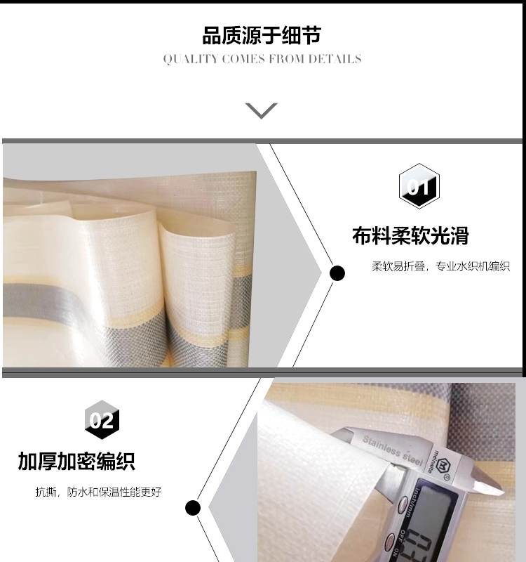 金包銀色PE防水篷布品質源于細節:布料柔軟光滑,柔軟易折疊,專業水織機編織;加厚加密編織,抗撕,防水和保溫性能更好。