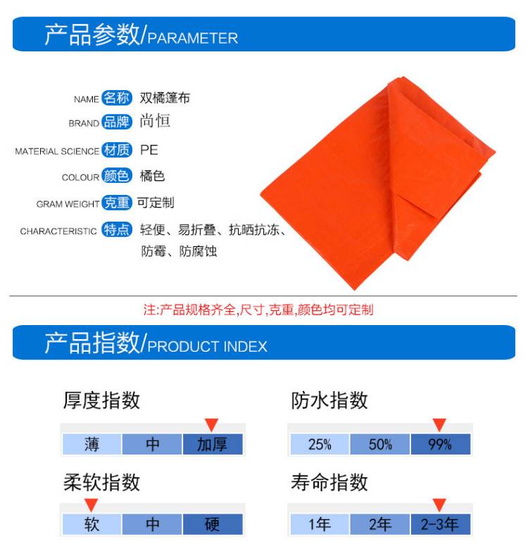 雙桔色PE防水篷布加厚涂層,加厚升級材質,色澤鮮艷,紋理清晰,不怕折疊