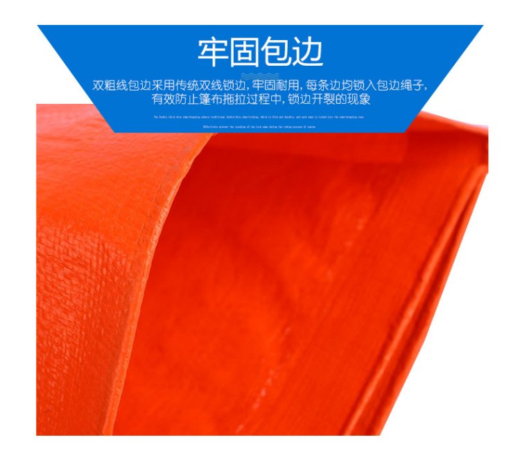 雙桔色PE防水篷布牢固包邊,雙粗線包邊采用傳統雙線鎖邊,牢固耐用,每條邊均鎖入包邊繩子,有效防止篷布拖拉過程中鎖邊開裂的現象